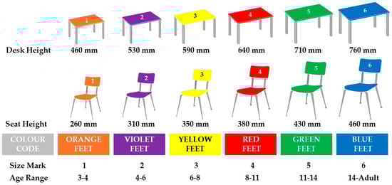 Furthermore, the degree of mismatch between the seat and desk size/color assigned to the students (see Figure 2) was evaluated using the formula based on multiple anthropometric measurements. A mismatch was considered when the size/color of one piece of furniture did not match the other, according to the parameters established in the reference furniture catalog of the European Union (e.g., yellow seat/size 3 and red desk/size 4).
