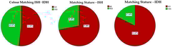 Color-coded matching between ideal sitting height (ISH) and ideal desk height (IDH), matching stature to ISH, and matching stature to IDH (global data, not stratified by sex, country, or grade level).