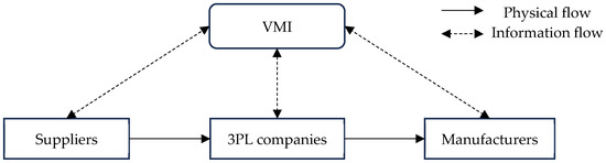 In today’s highly competitive global market environment, small- and medium-sized enterprises (SMEs), particularly in the manufacturing sector, face numerous challenges. The tight integration of global production networks can cause entire industrial chains to halt when there is a shortage of critical components, leading to significant supply chain disruptions [1]. Effectively managing the supply chain has become critical for the survival and development of these businesses. Vendor-managed inventory (VMI), as an advanced supply chain management approach, is increasingly adopted by companies aiming to enhance efficiency and responsiveness to market fluctuations [2]. In a VMI arrangement, the collaboration among suppliers, manufacturers, and third-party logistics (3PL) companies significantly optimizes supply chain management. Through integrated VMI systems and close cooperation, improved information flow and resource sharing are achieved, effectively reducing supply chain interruptions and the bullwhip effect, thereby significantly enhancing the resilience and responsiveness of the entire supply chain [3].