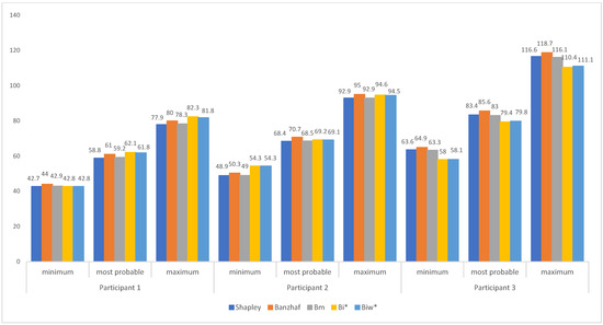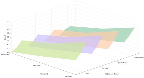The Banzhaf value is the final distribution value based on the marginal contribution of the coalition members across all sub-coalitions. In this case, the sum of the distribution values of each coalition member is (159.2, 217.3, 293.8) million dollars (USD), which significantly exceeds the total revenue value of the coalition of (155.2, 210.7, 287.3) million dollars (USD). In particular, it is evident in Figure 3 that the level of gains for Banzhaf values is generally higher. This over-distribution results in a blank check that cannot be honored, thus making this revenue distribution scheme difficult to achieve. The multiplicative normalization of the Banzhaf value, termed the Bm value [65], adjusts for excess benefits by proportionally reducing each member’s allocated share, resulting in a more practical and improved distribution method. However, both the Banzhaf value and the Bm value consider only the contributions of coalition members in their respective sub-coalitions, overlooking the contributions of other members within the sub-coalitions and the contributions of the sub-coalitions formed by the members to the grand coalition. This lack of comprehensive consideration of the complex dynamics within the coalition may result in members with higher contributions not receiving their due profits, thus affecting their satisfaction with the coalition and their willingness to cooperate in the future.