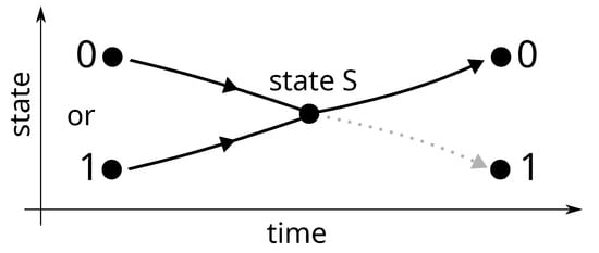 Consider now the particle in a bistable potential landscape with two minima separated by an energy barrier. From the beginning of his paper [1], Landauer asks whether we can construct a single time-varying force, , which when applied to the particle will cause it to end up in state 0 if it was initially in either in state 0 or state 1 (see Figure 1). Note that, in doing so, he implicitly makes a small shift in the meaning of “external intervention” needed for the erase procedure, which here becomes “force applied to the particle”. Next, Landauer observes that if this single time-varying force exists, then its time reversal must allow the trajectory of the particle to bifurcate, which is impossible with deterministic mechanics. It follows that does not exist. The erase process is thus necessarily uncontrolled and spontaneous somewhere, between a well-determined position 0 or 1 and the junction point (or bifurcation in the other direction) where the system is neither in 0 nor in 1. Bennett [28] calls the state of the system at this junction point the standard state or state S.