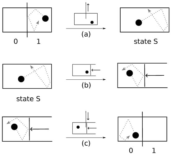 A clear representation of Landauer’s erasure scenario was proposed by Maroney [22]. A particle is in a box with a vertical partition. If the particle is on the left, the logical value is 0; if it is on the right, it is 1. Landauer’s erase procedure is as follows (see Figure 2):