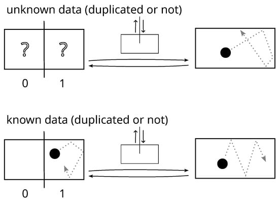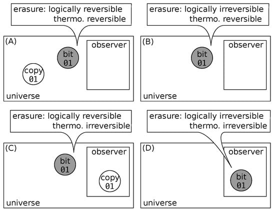 Actually, in the framework of Landauer’s hardware and erasure (Figure 2), it is possible to obtain for the erasure all the possible combinations discussed at the end of Section 3.2: logically reversible or not and thermodynamically reversible or not. For this, the bit is materialized under the form of a particle in a box partitioned into two volumes. For the sake of simplicity, the operation undergone by the bit is reduced to the first step of Landauer’s erasure—the one that corresponds to the expansion of the phase space and is responsible for Landauer’s result. Here, this step is performed by removing the partition between the two compartments of the box (step a, Figure 2). For commodity of language, let us call this operation “erasure” (with quotes because it is not really speaking of an erasure, i.e., set to 0) and that of putting the partition back “reverse erasure”. The “erasure” operation causes the final state of the bit to be the same whatever its initial logical state, so its logical irreversibility is judged solely on the basis of the existence or not of a copy. The hardware-bit in question belongs to an overall system (the universe) made partly of two computers. The first computer can be viewed as a demon; he knows everything about the present moment of the universe such that he has the ability to tell whether of not the “erasure” causes a loss of information, i.e., whether or not it is logically irreversible—that is, in our case, whether the initial value of the bit has been copied somewhere or not. The second computer is an observer, which can be identified as ourselves. The only things the observer knows about the universe are those recorded in his brain’s memory (a subset of the universe’s memory). Regarding the “erasure” and “reverse erasure” sequence, the only ability of the observer is to tell whether or not it restores the hardware-bit to its initial thermodynamic state based on what he knows about it, i.e., whether or not the “erasure” is thermodynamically reversible.