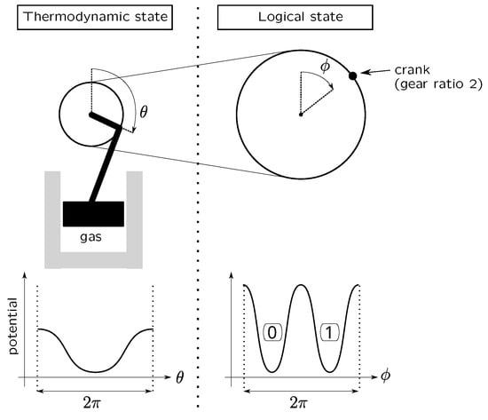 Two-to-one correspondence between logical states (right) and thermodynamic state (left). The latter is stable when the gas under the piston is at the same pressure as above. The piston is driven by a crank and a gear ratio of 2 so that the only stable position of the piston corresponds to two stable positions for the crank, which materialize the binary values. The logical state is evaluated based on the position of the crank, whereas the thermodynamic state is determined on the basis of the partial information concerning the position of the piston.
