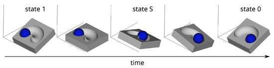 To fix ideas, let us first consider a particle in a potential energy landscape, which can be viewed as a topographic relief—that is to say, the result of (1) a short range repulsive interaction between the particle and a non-flat surface and (2) an attractive field E perpendicular (in average) to the surface. The force F experienced by the particle does not only result from the field but also from its interaction with the surface. So, the force depends on where the particle is located and can be different depending on whether it is in position 0 or 1. It immediately follows that a single time-varying field leads to different time-varying forces according to the (initial) position of the particle, thus reconciling the requirement of uniqueness with deterministic mechanics. When performing the first step of erasure, which is between state 0 or 1 to state S (see Figure 1), it is as if a conditional statement was carried by the pre-existing topographic relief and did not need to be implemented by the erase procedure itself. When performing the second step, at the bifurcation from state S to either state 0 (full black line in Figure 1) or 1 (dotted gray line), a bias can be applied to choose the path leading to 0, exactly as with Landauer’s procedure. This observation completely invalidates Landauer’s reasoning that led him to the conclusion that the first step of the erasure is necessarily spontaneous and cannot be quasistatic. In fact, this is not necessary at all.