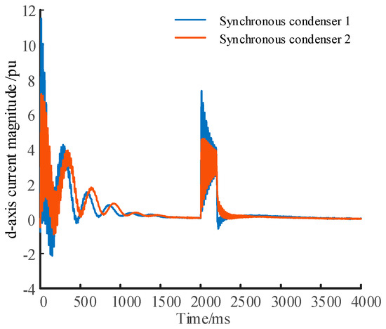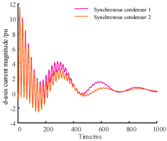 From (10), with Xd held constant, X′d determines the magnitude of the stator current, and Ta determines the oscillation time. Figure 2 illustrates the stator current output of two synchronous condensers during a three-phase short-circuit fault. The X′d is 0. 165 pu for the synchronous condenser 1 and 0.30 pu for the synchronous condenser 2.