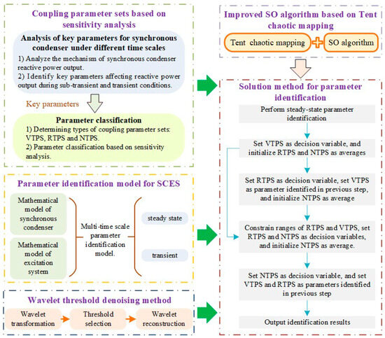 The parameter identification approach for the SCES is illustrated in Figure 4. The key parameters of the synchronous condenser are selected for identification. Furthermore, three sets of coupling variables are established based on sensitivity analysis. Additionally, a parameter identification model is developed under steady-state, sub-transient, and transient conditions. Moreover, the measurement data are preprocessed using the WTD method. The parameter identification relies on the response data of the synchronous condenser and its excitation system. Thus, the proposed approach can be utilized online to collect the response data and update the model parameter periodically.