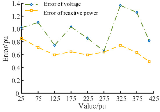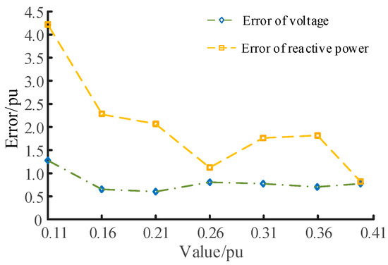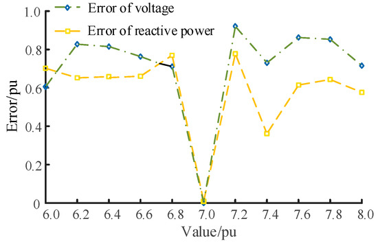 The parameters of the SCES are classified into RTPS, NTPS, and VTPS. Taking X′d, T′d0, and Ka as examples, the variations in error trends concerning these parameters are illustrated in Figure 5, Figure 6 and Figure 7. From Figure 5, it can be seen that the variation in reactive power error is significantly larger compared to the voltage error as the parameter X′d changes. An analysis of Figure 7 and Figure 8 reveals that as the parameter Ka varies, the variation in voltage error surpasses that of reactive power error. However, for the parameter T′d0, both voltage and reactive power errors exhibit similar changes as its value varies. When both parameters Ka and T′d0 reach their respective set values, both errors become zero.