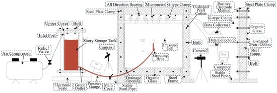 The system equipment composition for this test is shown in Figure 1. The test platform is primarily used to prepare the test materials and support the grouting equipment. The grouting system’s main function is to regulate the grouting process. The waterproof system is employed to seal the test apparatus, while the measurement system records various parameters throughout the experiment. The main process of the test includes loading the prepared grouting material into the test box, filling the slurry tank, and using an air compressor to inject the slurry into the soil. Additionally, a computer is utilized to collect data throughout the grouting process, while a camera records the diffusion of the slurry vein.