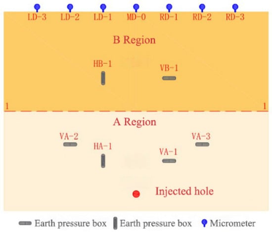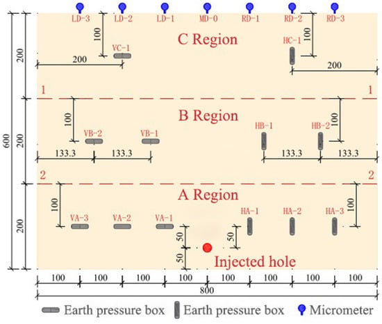 Given that the state of the clay body significantly influences slurry diffusion and grouting effectiveness, two hydraulic jacks are primarily used to apply different pressures from above to simulate soil conditions at varying depths and in situ stress levels. The soil moisture content in the test is maintained at approximately 23%, and the soil compactness is categorized into dense, medium dense, and soft, with densities of 1.6 g/cm3, 1.4 g/cm3, and 1.2 g/cm3, respectively. The monitoring data primarily include surface displacements and internal earth pressures. The measuring points in the model box are arranged as illustrated in Figure 3. The three areas, A, B, and C, are evenly divided from top to bottom. The earth pressure boxes are symmetrically positioned on the left and right sides, with the number of arrangements decreasing from the bottom to the top.