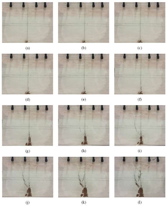 Taking the medium-density stratum test condition as an example, the diffusion morphology of slurry veins during the grouting process was analyzed. Figure 4 illustrates the evolution of the slurry veins, which can be categorized into four distinct stages. Stages Figure 4a–c represent the compacting and bubbling phase; stages Figure 4d–f correspond to the initial splitting phase; stage Figure 4g marks the compaction of the slurry vein; and stages Figure 4h–l depict the secondary splitting phase.