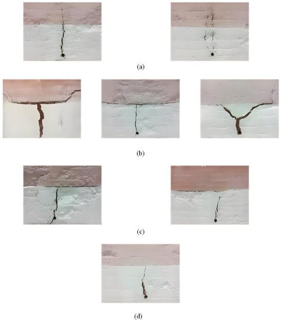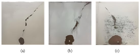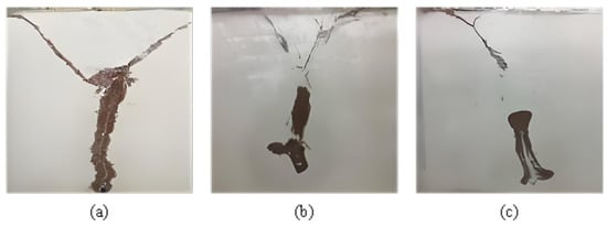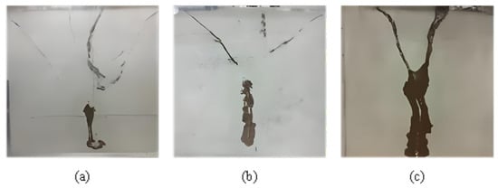 In homogeneous strata, two primary diffusion patterns of slurry veins are observed, as shown in Figure 5, Figure 6 and Figure 7: Y-shaped and inclined deflection shapes. The soft stratum predominantly exhibits the Y-shaped pattern, while the dense stratum primarily displays the inclined deflection shape. The medium dense stratum produces both Y-shaped and inclined deflection patterns, depending on the varying water/cement ratios. Based on the test results, the formation of the diffusion patterns of slurry veins can be divided into two stages. In the first stage, both patterns exhibit vertical diffusion of the slurry veins, which preferentially diffuse upward along the direction perpendicular to the horizontal minor principal stress, while compressing the surrounding soil. The two types of patterns differ in the second stage. The Y-shaped vein undergoes left–right symmetrical bifurcation diffusion, whereas the deflected pattern displays inclined diffusion.