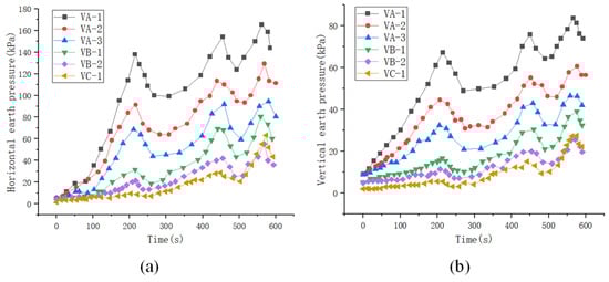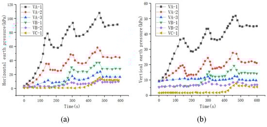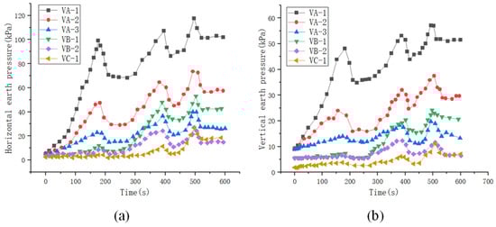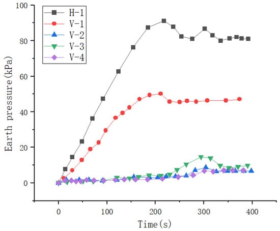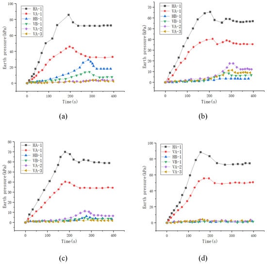 Under the condition of slightly hard-soft soil, as illustrated in Figure 18a, the grout vein diffuses vertically upward from the grouting port in area A. This diffusion causes an increase in soil pressure on both sides of the grout vein, which subsequently decreases after reaching the maximum soil pressure. After the grout vein reaches area B, it continues to diffuse vertically upward, resulting in an increase in soil pressure within that area. Throughout this vertical diffusion process, the earth pressure at the interface remains relatively constant. Under the condition of symmetrical deflection in medium hard-soft soil, as shown in Figure 18b, the vertical grout vein leads to an increase in soil pressure in area A. As the grout vein deflects horizontally and continues to diffuse, the horizontal soil pressure on both sides experiences a slight increase. Under the condition of unilateral deflection in medium hard-soft soil, as illustrated in Figure 18c, the change in earth pressure resembles that observed with symmetrical deflection. However, due to the unilateral deflection, the earth pressure on the horizontal side increases significantly. In hard-soft soil conditions, shown in Figure 18d, the diffusion of slurry veins is impeded at the stratigraphic boundary, leading to a notable increase in earth pressure in area A, while there is no significant increase in earth pressure in other regions.