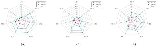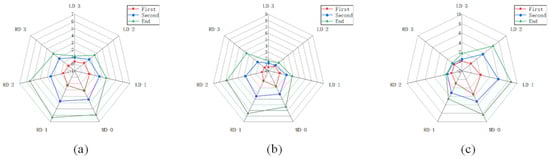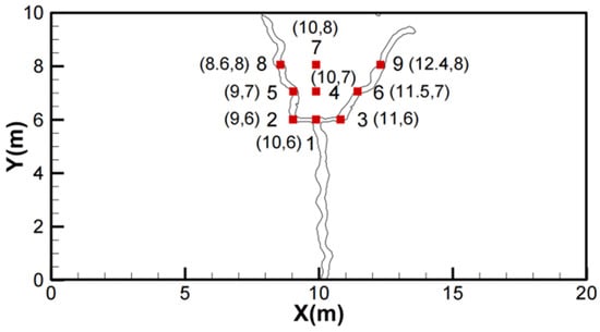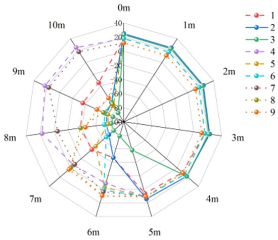 In the case of l = 2 and v = 6 during the slurry vein diffusion process, related research was conducted. Figure 34 illustrates three key stages: (a) before the slurry vein diffusion reaches the crack at 445 s, (b) when the diffusion reaches the fracture at 640 s, and (c) the small principal stress σ3 cloud map as the diffusion approaches the surface at 960 s. In these three cases, along with the nine measuring points and their position coordinates arranged in the slurry veins and soil, as shown in Figure 35, a radar map depicting the changes in the minor principal stress at the nine measuring points with the diffusion length of the slurry veins is presented in Figure 36.