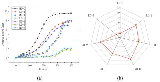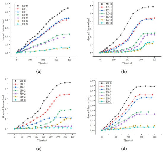 The variation in surface displacement resulting from four different types of slurry veins differs across various locations, as illustrated in Figure 19. The patterns for vertical penetration and vertical blocking slurry veins are comparable; both exhibit an increase in surface uplift during the first stage, followed by stabilization in the second stage. In the initial stage, the displacement at the central measuring point increases significantly, while in the second stage, the measuring points on either side show a marked increase. Notably, the displacement changes further from the central measuring point lag behind. The shape of the unilateral deflected vein results in a significant increase in surface displacement on the deflected side during the second stage, while the opposite side remains relatively unchanged. Experimental data indicate that the surface uplifts associated with the four types of veins are all “convex” shapes. Notably, the unilateral deflection shape produces an asymmetric “convex” uplift, whereas the other three types exhibit symmetrical “convex” uplifts, as shown in Figure 20.