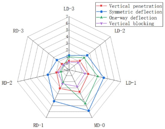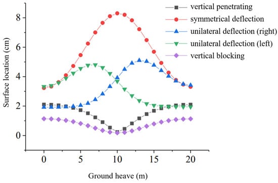 By analyzing the uplift patterns associated with different slurry vein morphologies, a correspondence between the morphology of the slurry veins and the surface uplift was established. Figure 33 illustrates the surface uplift curves for five slurry vein morphologies in two layers of soil, which can be categorized into three types of uplift. The initiation modes include symmetrical “concave” uplift corresponding to vertically penetrating slurry veins and vertically blocking slurry veins; unilateral deflection resulting in asymmetrical “convex” bulges of the slurry veins (to the left and right); and symmetrical deflection leading to symmetrical “convex” uplift of the slurry vein.