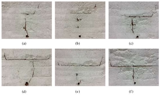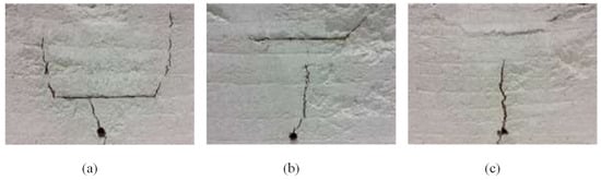 Secondary Splitting Stage: After the slurry’s hydraulic pressure concentrates a sufficient amount of energy, the initial splitting crack ceases to propagate further. Instead, a new crack forms to the left of the original split, measuring 0.3 cm in width. As seen in Figure 4h, this crack propagates 15 cm and causes “V”-shaped damage near the surface. When the crack reaches 20 cm in length above the surface, the extent of surface damage increases. Simultaneously, the surface damage cracks extend downward to approximately 13 cm from the slurry bubble. As seen in Figure 4i,j, at this point, secondary cracks appear around the plasma vein, and the slurry fills the cracks extending downward from the surface. The final width of the foam reaches 10 cm, and the height extends to 15 cm.