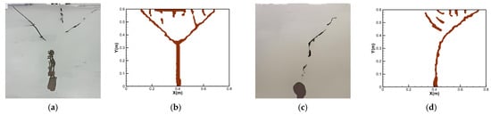 Figure 26a illustrates the shape of the slurry vein under a water/cement ratio of 1:1 in soft formation, while Figure 26b presents the slurry vein shape obtained from the numerical simulation of the same soft formation. Notably, the soft strata exhibit a Y-shaped vein diffusion pattern. Figure 26c depicts the slurry vein shape at a water/cement ratio of 1.5:1 in dense formation, and Figure 26d shows the slurry vein shape resulting from the numerical simulation of the dense formation.