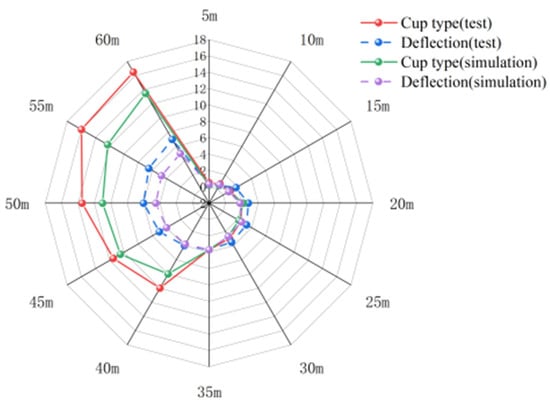 The numerical simulation results closely resemble the experimental findings; however, this alone does not sufficiently demonstrate the accuracy of the numerical method. To further validate the results, a comparison of the vertical displacement data from each measuring point on the surface was conducted. This comparison yields the maximum value diagram of surface uplift due to the diffusion of slurry veins, as shown in Figure 27, across different vertical positions of the model. Data comparison reveals that, during the first stage of slurry vein diffusion, the results from both the tests and numerical simulations are similar when the slurry vein diffuses vertically near the grouting hole. In the second stage of vein diffusion, the Y-shaped vein produces greater surface uplift than the deflection-shaped vein upon reaching the upper part of the model. Consequently, the data obtained from the numerical simulation closely align with the experimental results. This consistency demonstrates that the numerical simulation method is more accurate.