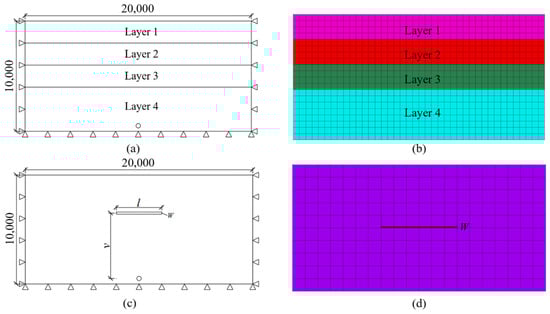 In the heterogeneous stratum model, the dimensions, boundary conditions, grouting hole arrangement, and loading steps are consistent with those of the homogeneous stratum, as illustrated in Figure 28. Layer 1 is hard soil layer, Layer 2 is soft soil layer, Layer 3 is hard soil layer, and the Layer4 is soft soil layer. W is a crack.