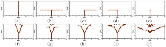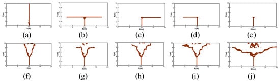 Four diffusion modes are presented: Figure 31a vertical penetration; Figure 31b symmetrical deflection shape; Figure 31c and Figure 31d unilateral deviation conversion; and Figure 31e vertical blocking shape. Figure 31f–j illustrate the vein diffusion patterns for three-layer and four-layer soft and hard uneven soil. Notably, Figure 31f exhibits a cup (Y)-shaped profile, Figure 31j presents a dish-shaped form, and Figure 31g–i transition from cup (Y)-shaped to dish-shaped. The transition state indicates that the angle between the branch deflection vein and the vertical increases, with the fourth layer soil ratio in Figure 31g being higher than in Figure 31f. Consequently, when the slurry vein in Figure 31g encounters the fourth layer of soil, it will not continue to spread vertically to the surface but will instead exhibit horizontal deflection. The veins in Figure 31h,i gradually spread in the horizontal direction, while the veins in Figure 31j deflect and step outward to the sides. This side diffusion ultimately leads to the formation of dish-shaped slurry veins. Additionally, these five types of slurry vein morphologies will induce varying degrees of tensile failure in the soil at the surface.