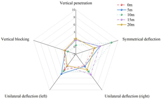 In Figure 33, the uplift value for the vertical penetrating vein is 0.24 cm at the center and 2.1 cm on both sides, while the uplift value for the vertical blocking vein is 0.18 cm in the center and 1.13 cm on both sides. This difference occurs because the vertical vein spreads upward to the surface, resulting in a limited influence range and a more pronounced squeezing effect on either side. The asymmetrical “convex”-shaped uplift caused by the unilateral deflection vein leads to greater surface displacement on the deflected side, regardless of whether the deflection is to the right or left. The maximum displacement occurs directly above the midpoint of the horizontal vein. For instance, the maximum uplift value of the right-deflection vein is 5.1 cm, occurring near the surface at 14 m, with the leftmost uplift measuring 1.92 cm and the rightmost uplift measuring 3.42 cm. In contrast, the maximum uplift value for the vein deflected to the left is 4.81 cm, appearing near the surface at 6 m, with the leftmost uplift at 3.32 cm and the rightmost uplift at 1.94 cm. This occurs because the horizontal slurry veins generate uplift in the soil, with the effect being most pronounced at the center of the horizontal slurry veins. The symmetrical “convex” uplift of the symmetrical deflection vein mirrors that of the unilateral deflection vein on both sides of the model, with measurements of 3.23 cm on the left side and 3.31 cm on the right. The uplift at the center reaches 8.3 cm, exceeding the maximum uplift value of the unilateral deflection, indicating that the uplift effect of the symmetrical deflection horizontal vein is more significant than that of the unilateral horizontal vein.