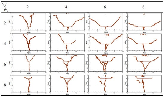 Additionally, it is observed that there is more than one vertical slurry vein in five working conditions: (l = 4, v = 6), (l = 4, v = 8), (l = 6, v = 4), (l = 6, v = 6), and (l = 8, v = 6). In these instances, the slurry vein bifurcates before encountering the fracture, with the bifurcated slurry vein still reaching the fracture and spreading along it. In the cases of (l = 6, v = 8) and (l = 8, v = 8), the branch slurry vein appears on the left side of the vertical slurry vein. This branch first spreads horizontally and then deflects towards the fracture due to its influence.