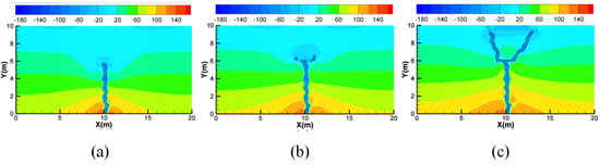 By simulating 16 working conditions involving varying fracture lengths and distances between fractures and grouting holes, the slurry vein morphology presented in Figure 32 is obtained. The numerical simulation reveals that vertical slurry veins will enter the fractures upon encountering different lengths and positions, spreading laterally along the fracture. When the slurry veins reach the edges of the fracture, they deflect upwards. This diffusion mode aligns with the test results discussed in Section 3.2.