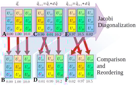 Graphical summary of the Sequential Diagonalization Strategy (SDS). Each block shows the resulting diagonalizing transformation U, where each column represents an eigenvector, with its corresponding eigenvalue marked below it. The background arrow show the sequence of diagonalizations, with the top row following the Jacobi diagonalization while the bottom row shows the reordered matrices. (A) is the starting point, representing the ordering to be preserved. It is stored as the first reference, shown in (B); after a small step , a new eigensystem is obtained with the Jacobi method, shown as (C). This is compared with the previous reference, using Equation (15), in order to know the correct way to reorder (C) to match (B); (C) is stored as a new reference, and the cycle repeats for the next step (E). In summary, while (A,C,E) result from the diagonalization, with random ordering, (B,D,F) are the values actually stored.