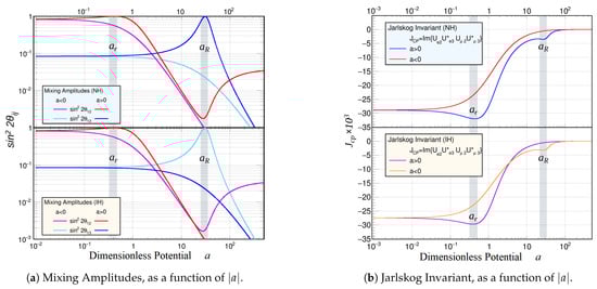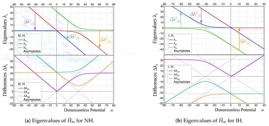 Eigenvalues of , in Equation (18), for NH (a) and IH (b). Each individual eigenvalue is drawn as a function of the dimensionless background descriptor a, representing the MSW effect in ordinary matter. The differences are also shown, since they correlate to the oscillation length. All vacuum values are taken from Table 1.