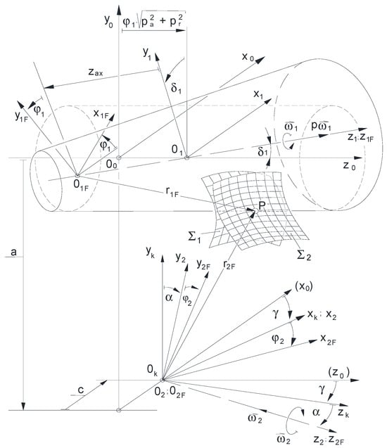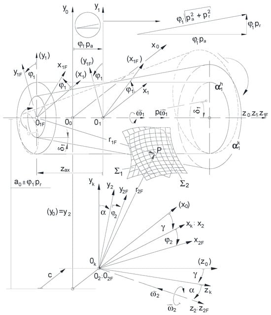 In many cases, the mathematical definition of a complex surface differs from the surface created by machining. The differences are mainly caused by the surface of the machining tools created by the technological environment and the real practicable path of movement that can be created. Such a case occurs, for example, when machining with a grinding wheel, as the reduction in the center distance due to the wear of the working surface of the grinder causes profile distortion. Furthermore the variable center distance between the tool shaft and the worm shaft during the machining of the conical worm would also require a continues change in the tool profile. The simultaneous examinations of the geometry and the trajectory of the tool are the mathematical basis of several engineering research works [,]. This is also the case with the working surfaces of cylindrical or conical worms, namely that the defined helicoid surface differs from the surface machined at the existing technological conditions. The integrated model [] was developed to analyze these deviations. For the analysis of the production geometry and computing of the elements of the conical and cylindrical worm gear drives, the coordinate systems extended with the geometrical parameters are shown in Figure 1, which is prepared for the traditional thread grinding machine.