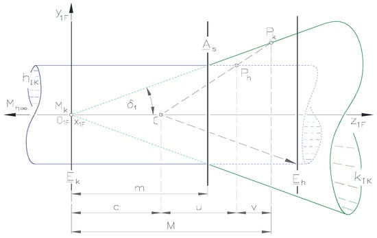 During the central collineation mapping, the points of the Eh plane are transformed into points in infinity, and disappear into infinity, which is why it is called the vanishing plane. The vanishing plane Eh is as far from the center C as the vanishing plane Ek of the cone is from the fixed plane As. As shown in Figure 3, the half-opening angle of the right circular cone is the angle δ1. The height of the cone between the fixed plane As and the vertex Mk is denoted by m. The radius of the common circle of the right circular cylinder and the right circular cone laying on the fixed plane As is denoted by r. The radius of the circle of the point Pk laying on the cone is denoted by R. In the normed homogeneous Cartesian coordinate system, the coordinates of the points of cylinder (marked by xI and xK) complete the following relation: