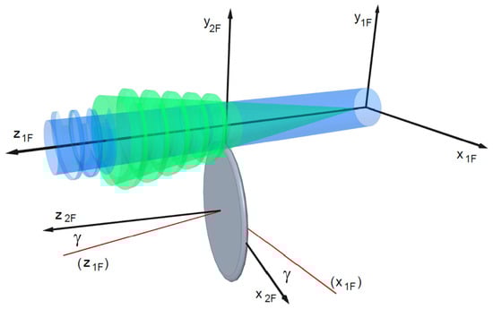 In the constructive geometric model, as indicated by arrows in Figure 3, the axis of the conical helicoid has been adjusted to the axis of the cylindrical helicoid with the aim of writing the central collineation relationship between their reference surfaces. The relationship between the coordinate systems used in the constructive geometric model and the geometric parameters for the production geometrical examination of the cylindrical or conical worms or hobs on the common zF1 axis, as well as the gears or worm machining tools located on the zF2 axis, are also shown in Figure 3.