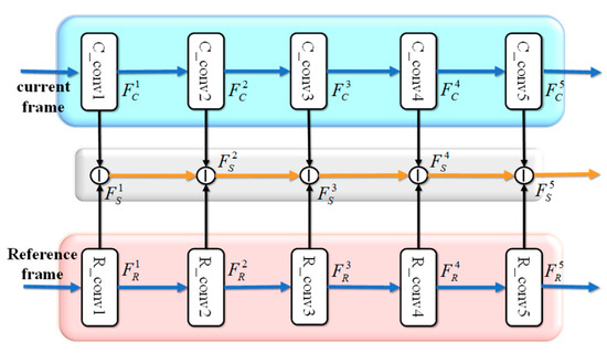 where . and denote information of the current frame and reference frame at different levels, respectively.