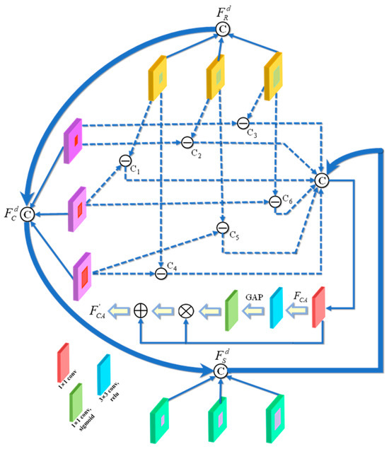 First, we utilize SCN to acquire different levels of encoded features . Also, change information is obtained through the above features. can be represented by Equation (1).
