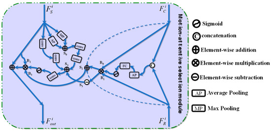 When the network is extended to deeper layers, some details are lost during the process of feature extraction, resulting in issues like indistinct target outlines and incomplete targets in the detection results [54]. In the face of the above problems, a conventional method is to use a skip connection to directly transfer the information from the encoding stage to the decoder. However, this technique will introduce irrelevant information, such as noise. To alleviate this problem, we design a Motion-Attentive Selection Module (MASM) to enhance the effective transfer between features. Figure 4 presents the details of MASM.