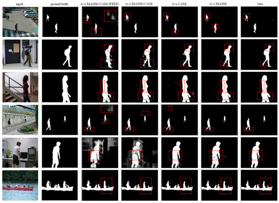 The designed CAM and MASM help to improve the accuracy of moving object detection. However, CAM has a slightly simpler fusion mechanism for the same type of features, and the extraction and fusion of key information can be enhanced by the attention mechanism in subsequent research. MASM adopts the same processing strategy for different levels of change information and salient information; it can be considered to construct a sub-strategy processing mechanism in MASM for the characteristics of different levels of features.