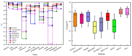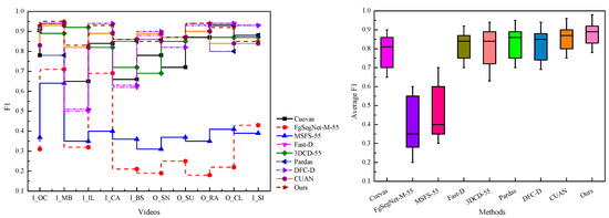 - LASIESTA dataset: In Table 3, we report the quantitative performance of nine techniques on the LASIESTA dataset. Figure 6 illustrates the performance trends in different approaches on the LASIESTA dataset. It can be seen that our designed network is competitive compared with others. The last row of Table 3 presents the average F1 obtained by the different algorithms, where our method achieves 89%. The performance is improved by 8%, 54%, 49%, 5%, 5%, 3%, 4% and 2% compared to Cuevas [59], FgSegNet-M-55 [25], MSFS-55 [21], Fast-D [60], 3DCD-55 [61], Pardas [62], DFC-D [63], and CUAN [64], respectively. Besides, our method also presents a superior performance on single-type videos.