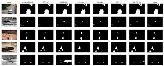 - Visual analysis: Figure 8 and Figure 9 illustrate the qualitative comparison of different methods and our approach [23,24,26,65,67,69]. These examples involve many challenging and complex scenarios, such as shadows, lighting variations, small-sized objects, atmospheric turbulence, and background disturbances. Clearly, the proposed network is able to correctly localize the object position and acquire moving objects with clear contours. The qualitative results highlight the effectiveness of our method in suppressing background interference and accurately distinguishing the object area. Moreover, the designed DAN exhibits the capability to detect objects at different scales.