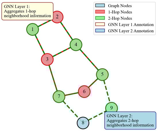 To illustrate this process, Figure 2 demonstrates how nodes aggregate 1-hop and 2-hop neighborhood information across different GNN layers. In a GNN, each node at the kth layer aggregates information from its k-hop neighbors (see Definition 1). For ease of understanding, we focus on specific nodes in the figure: nodes 2, 3, and 6 (highlighted in red) in the first layer, and nodes 1, 4, 5, 7, and 9 (highlighted in green) in the second layer. The red nodes—2, 3, and 6—are connected by red edges to their respective 1-hop neighbors: {1, 4}, {1, 4, 7}, and {5, 7}. Similarly, the green nodes—1, 4, 5, 7, and 9—aggregate information from their 2-hop neighbors connected by green edges: {4, 7}, {1, 7, 9}, {1, 4, 5, 9}, and {4, 6, 7}, respectively.