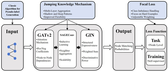 To provide a better understanding of the design and innovation behind the HybridGNN model, Figure 3 illustrates the complete process from input data to the final output of node matching probabilities. The diagram outlines how pseudo-labels are generated using classic algorithms as part of the input, which is then processed through a combination of GATv2, SAGEConv, and GIN layers. Note that these three types of layers serve as our candidate layers, and the selection and configuration of these layers within HybridGNN are determined based on the results of ablation experiments. Supported by the Jumping Knowledge mechanism, these layers enable multi-layer aggregation and flexibility. The Focal Loss is employed during training to address class imbalance, ensuring that the model places greater focus on difficult-to-classify examples. This comprehensive approach effectively captures graph structure information and facilitates solving complex graph matching tasks.