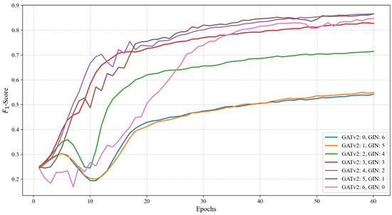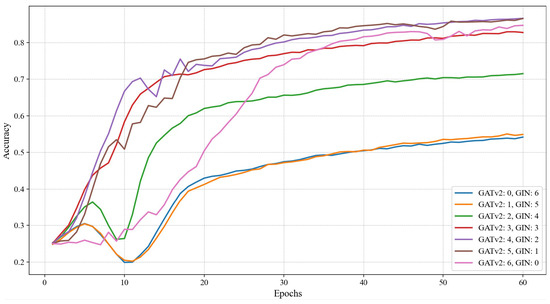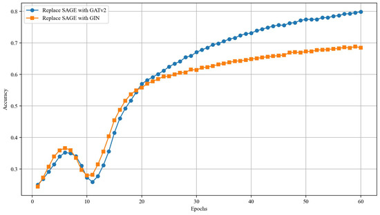- Graph Isomorphism Networks (GINs): The Graph Isomorphism Network (GIN) is a highly expressive GNN architecture specifically designed to capture detailed structural information from graphs by mimicking the Weisfeiler–Lehman (WL) graph isomorphism test [29]. The GIN achieves this by aggregating node features from neighboring nodes using a learned weighted sum, making it particularly effective for tasks requiring a fine-grained understanding of graph structure. This high level of discriminative power makes GIN especially suitable for graph matching tasks and other applications where subtle structural differences in the graph are critical.The GIN aggregation rule is defined aswhere represents the feature of node v at the k-th layer, is a learnable parameter, and denotes the set of neighboring nodes of v. The Multi-Layer Perceptron (MLP) in the GIN plays a crucial role in enhancing the model’s expressiveness, enabling it to capture complex and intricate graph structures. This architecture’s ability to differentiate between non-isomorphic graphs gives it a significant advantage in learning highly discriminative graph representations.