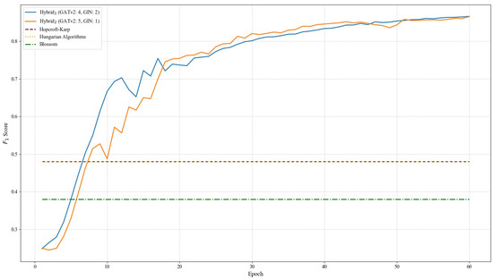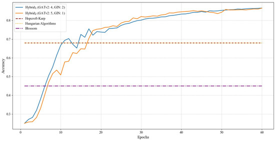 The experiments demonstrated that HybridGNN1 (GATv2: 4, GIN: 2) and HybridGNN2 (GATv2: 5, GIN: 1) excel in solving the maximum matching problem in complex bipartite graphs. By combining GATv2 and GIN layers, these models effectively capture both local and global dependencies, achieving better accuracy and F1-scores compared to traditional methods like the Hopcroft–Karp and Hungarian algorithms.
