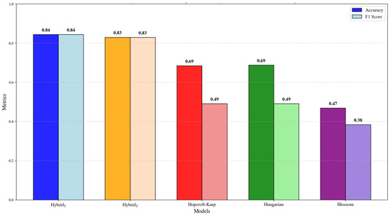Figure 13 presents a comprehensive comparison of memory consumption between HybridGNN1 (GATv2: 4, GIN: 2) and HybridGNN2 (GATv2: 5, GIN: 1) against traditional algorithms such as the Hungarian, Blossom, and Hopcroft–Karp methods. The analysis reveals that HybridGNN1 and HybridGNN2 achieve notable memory efficiency, with recorded usage of 50 MB and 53 MB, respectively. In comparison, the Blossom algorithm exhibits the highest memory footprint at 70 MB, while the Hungarian and Hopcroft–Karp algorithms record intermediate memory usage levels of 47 MB and 60 MB, respectively.