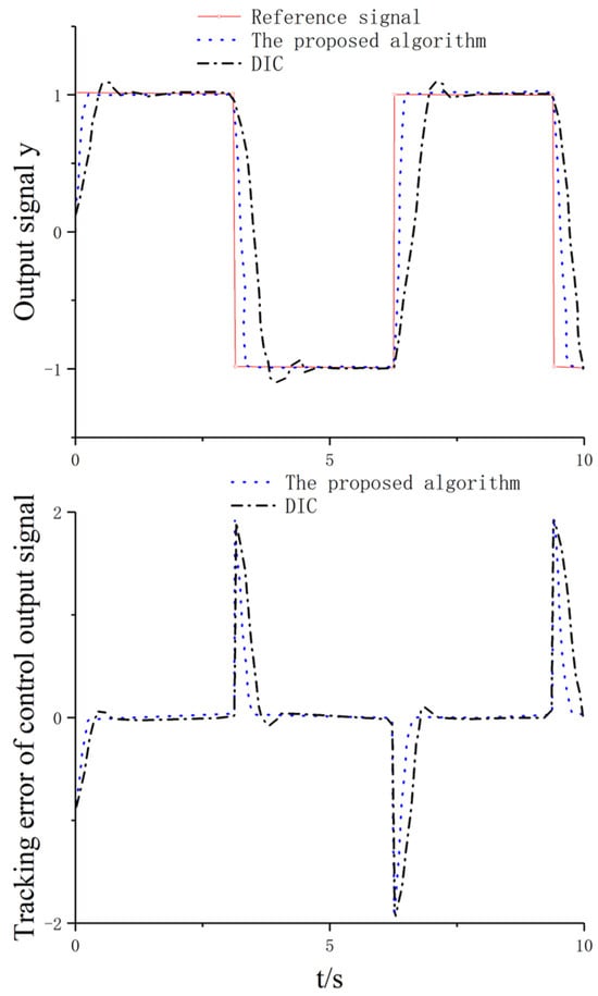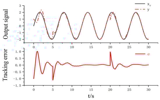 where , , and the reference signal is a square wave. The desired reference signal can be tracked by reasonably setting the system parameters. The dead zone parameters m = 1.5, = 2.5. The initial conditions and parameters of the system are presented in Table 1.