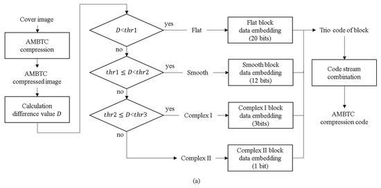 In 2015, Ou et al. [21] proposed a data hiding method based on AMBTC block classification, which classifies blocks as smooth or complex based on the difference between quantized values and a predefined threshold. In 2018, Hong et al. [22] proposed an Adaptive Pixel Pair Matching (APPM) technique based on block classification to improve the data hiding method for smooth blocks. The APPM technique slightly modifies the quantization levels, allowing smooth blocks to carry more secret data. In 2019, Kumar et al. [23] proposed a new hiding strategy that further divides image blocks into three categories: smooth, low complexity, and high complexity. Smooth blocks replace bitplane positions with secret data to enhance the payload of the block, while complex blocks hide 1-bit data by swapping the positions of two quantized values and flipping the bitmap values. Low-complexity blocks minimize the impact on the bitmap during hiding by calculating the Hamming distance. High-complexity blocks use the PVD method to adjust quantized values to hide secret data.