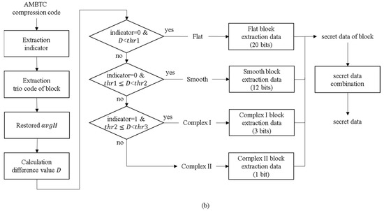 During the data extraction phase, when the receiver receives the stego AMBTC compressed codes, each block’s compressed code has a fixed length of 33 bits, with the first bit serving as an indicator. This indicator is essential for determining the data structure and the corresponding values represented by the compressed code, as outlined in Equation (6). If the indicator is “0”, the block type is determined using the difference value (D) from the compressed code. If the indicator is “1”, the relative order between avgL and avgH is used to identify the block type. The specific rules for determining each block type are summarized in Table 2. Once the block type is identified, the corresponding data extraction strategy is applied to accurately retrieve the hidden data. This approach ensures that each block is correctly interpreted, enabling reliable extraction of the embedded secret data from the stego AMBTC compressed image.