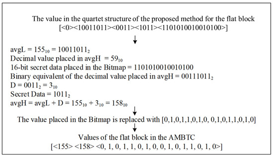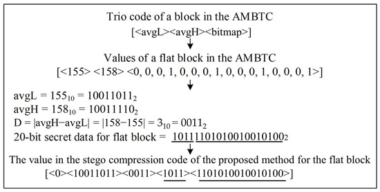 For flat blocks, the compression code format is [indicator (1 bit), avgL (8 bits), D (4 bits), data (4 bits), bitmap (16 bits)]. Figure 3 provides a detailed description of the embedding process. First, the 20 bits from the secret data are read, where 4 bits will be stored in the “data” position. The remaining 16 bits are carried by replacing the bitmap. Finally, the indicator is set to 0 and the stego compression code is outputted.