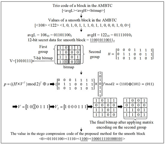 For smooth blocks, the compression code format is [indicator (1 bit), avgL (8 bits), D (4 bits), data (4 bits), bitmap (16 bits)]. A detailed description of the embedding process can be found in Figure 4. First, 12 bits from the secret data are read to be embedded, allocating 4 bits to the “data” position. The remaining 8 secret bits are carried using the bitmap, which is divided into 3 parts as illustrated in Figure 5. The first and second parts utilize Hamming (7,4) coding, as defined in Equation (5), to embed 3 bits of data each.