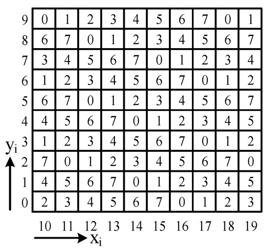 For complex I blocks, the embedding process is illustrated in Figure 6. The two quantizers, avgL and avgH, are mapped to the x-axis and y-axis, respectively. Initially, 3 secret bits are extracted from the secret data for embedding. These 3 secret bits are then converted into a decimal number, denoted as DN, which must match a value in the reference matrix M, as shown in Figure 7, according to the embedding rule.